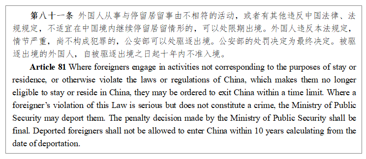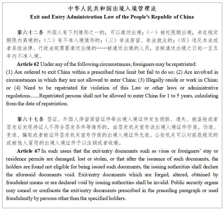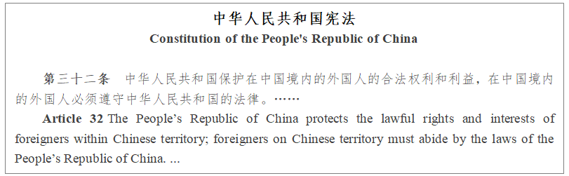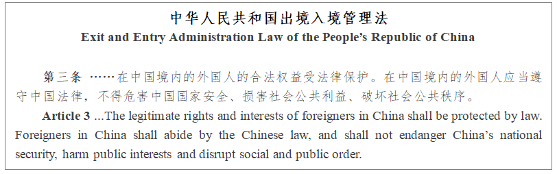 I. According to Constitution of the People's Republic of China and Exit and Entry Administration Law of the People's Republic of China, the legitimate rights and interests of foreigners in China shall be protected by laws. Foreigners in China shall abide by the Chinese laws, and shall not endanger China’s national security, harm public interests and disrupt social and public order.