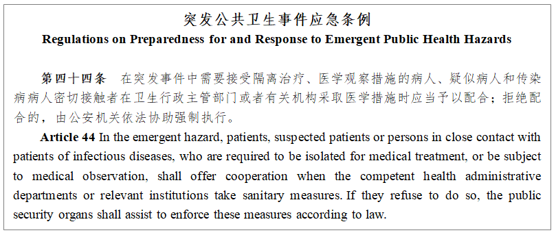 II. According to Exit and Entry Administration Law of the People's Republic of China, foreigners in China shall register their accommodation on time and comply with the identification inspection of public security organs. In addition, according to Law of the People's Republic of China on the Prevention and Treatment of Infectious Diseases, Frontier Health and Quarantine Law of the People's Republic of China, and Regulations on Preparedness for and Response to Emergent Public Health Hazards, foreigners in China shall cooperate with the People's governments at all levels and relevant departments in China when they take monitoring, isolation as well as other measures for effective prevention and control of the spread of infectious diseases and protection of public safety and health.