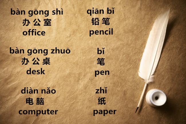 office.办公室。(ban4gong1shi4) computer. 电脑。(dian4nao3) desk. 办公桌(ban4gong1zhuo1)。pen笔 (bi3). pencil. 铅笔(qian1bi3)。paper. 纸 (zhi3) My computer isn’t working. 我的电脑坏了。(wo3 de dian4nao3 huai4 le.) All in today’s Chinese Studio.